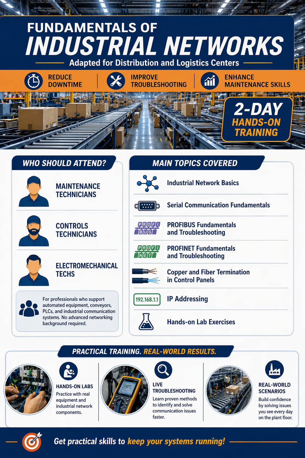 This class teach students the fundamentals of the physical layer in industrial control systems, with a strong hands-on focus on terminating conductors and multiconductor cables in control panels and industrial connectors such as M12, RJ45, PROFIBUS, and PROFINET. Students also explore the role of industrial protocol gateways and gain a practical introduction to serial communication, PROFIBUS, and PROFINET fundamentals. The result is a solid foundation for installing, identifying, and troubleshooting industrial network components in the field.